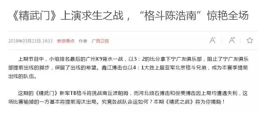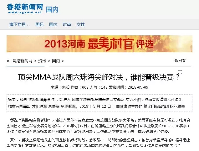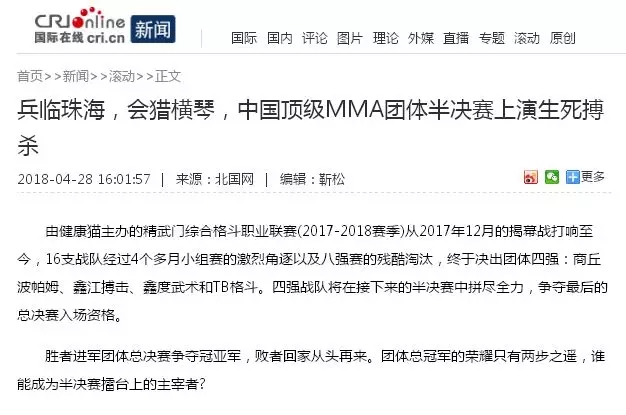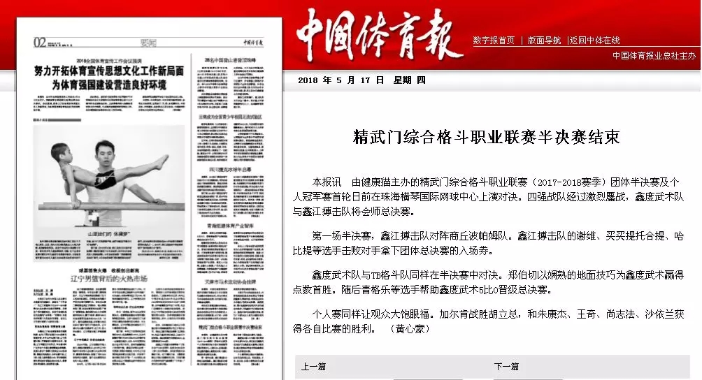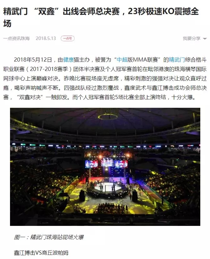 2018年5月12日,精武門綜合格斗職業(yè)聯(lián)賽(2017—2018賽季)團(tuán)體半決賽在珠海橫琴國際網(wǎng)球中心圓滿落幕。鑫江搏擊3:2險(xiǎn)勝商丘波帕姆,成功拿到團(tuán)體總決賽的入場券。