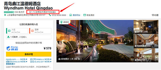 青島鑫江溫德姆酒店能夠從眾多競爭者中脫穎而出,不僅僅是酒店自身過硬設施設備,更加是員工們精誠合作用心服務和真誠待客的結果,并有賴于賓客的信任和肯定,使得青島鑫江溫德姆酒店在貓途鷹網站1763家青島酒店中排名第4!