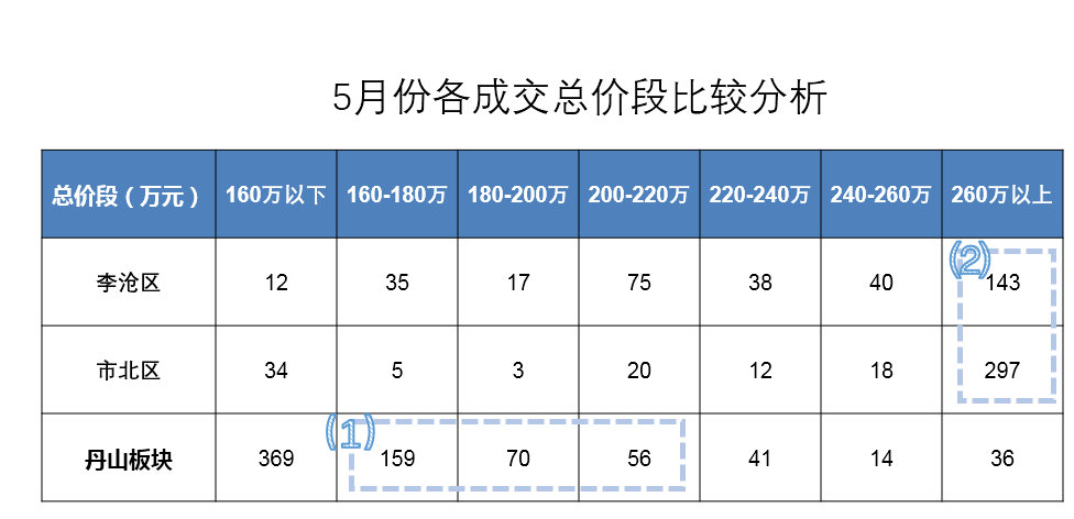 選擇丹山版塊的客群中,市區外溢的改善型需求是主力之一。從總價段比較分析來看(下圖),丹山版塊在160-220萬元三個總價段成交比較集中,是改善型需求的主力價格段(如1所示),而市北、李滄的改善需求成交主力都在260萬元以上,甚至更高(如2所示)。