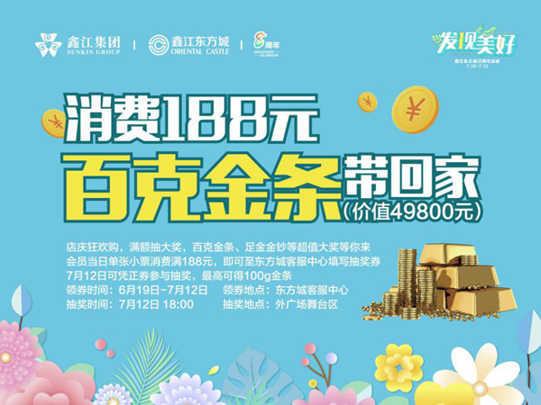 店慶狂歡購,滿額抽大獎(jiǎng),6月19日-7月12日,會(huì)員憑當(dāng)日單張小票消費(fèi)滿188元,即可至客服中心填寫抽獎(jiǎng)券,7月12日可憑正券參與抽獎(jiǎng),最高可得100g金條!還有20g足金金條、10g足金金條等超多黃金大獎(jiǎng)哦!