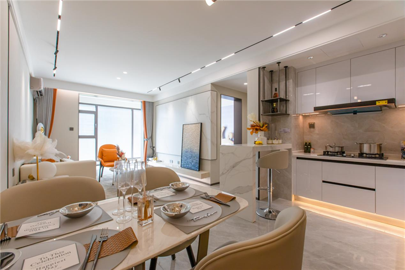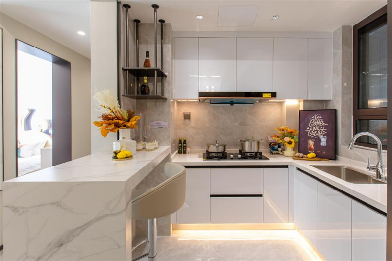 為家人烹飪美食,滿足一家人的味蕾。方正空間搭配L型布局,空間實用,黃金動線,流暢操作,半開放式吧臺,打造一個便捷早餐、品味下午茶的臨時場所,廚房空間早已成為一條拉近夫妻感情距離的隱形紐帶。