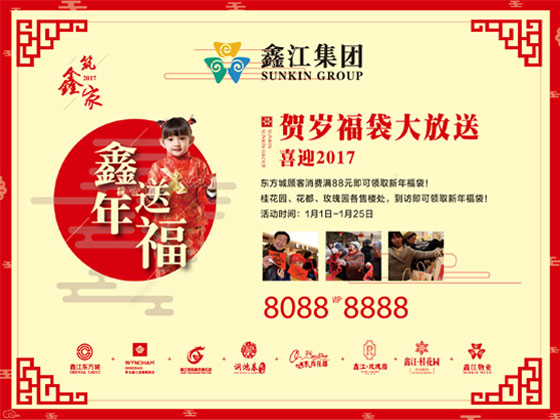 2016轉(zhuǎn)眼即逝,奏響了2017的新篇章,回首過去20載,鑫江集團(tuán)立足城陽南,與城市并肩一路同行! 值此佳節(jié)來臨,為感謝您的多年支持陪伴,鑫江集團(tuán)重磅四重驚喜,傾城來襲,恭祝島城人民新年快樂。