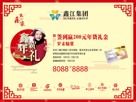 1月2日-1月21日,關(guān)注【鑫江集團(tuán)】微信公眾號,在線報名申請年貨禮金,期間累計簽到十次,即有機(jī)會免費參與1月21日,禮金直播抽獎,現(xiàn)場抽出200位獲獎粉絲,每位送出200元年貨禮金!