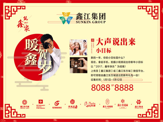 1月1日-1月12日,拍攝小視頻,說出你的新年小目標(biāo),以“2017,鑫年快樂“為結(jié)尾,上傳至【鑫江集團(tuán)】或【鑫江東方城】微信公眾號,即可免費領(lǐng)取新年禮包一份,同時,1月21日-27日,【青島東方城】微信公眾號,將開啟在線有獎轉(zhuǎn)發(fā),轉(zhuǎn)發(fā)視頻圖文至朋友圈,即可免費領(lǐng)取新年好禮一份。
