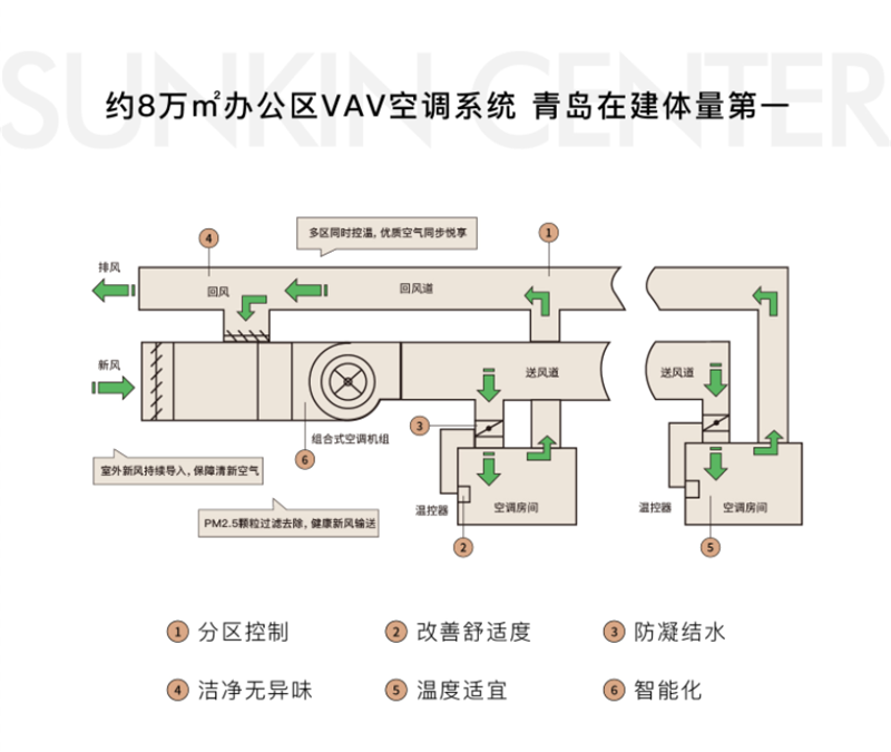 約2500㎡青島在建最大最高共享大堂,約18.8m高挑空,約58.8m無(wú)柱大跨度,青島在建最大、最寬、最高的共享大堂。